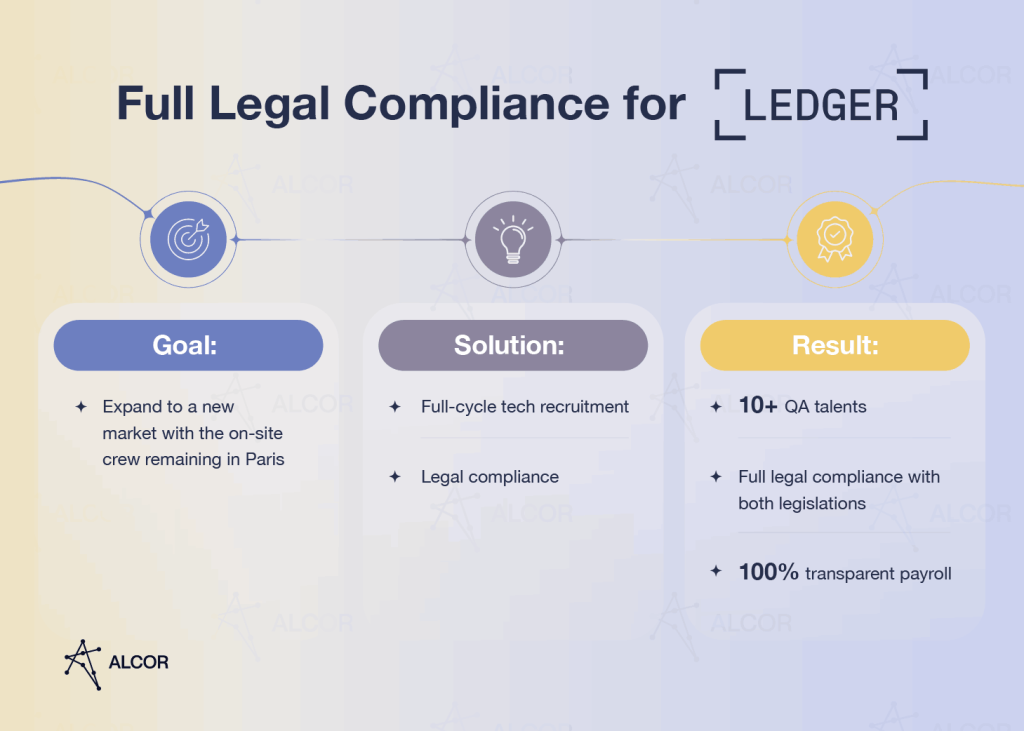 That’s why I recommend turning to a seasoned Employer of Record in Mexico. Alcor’s track record lists cases of achieving 100% legal compliance between the two companies’ locations. See our solution for Ledger, a French cryptocurrency company aiming to expand to another market.