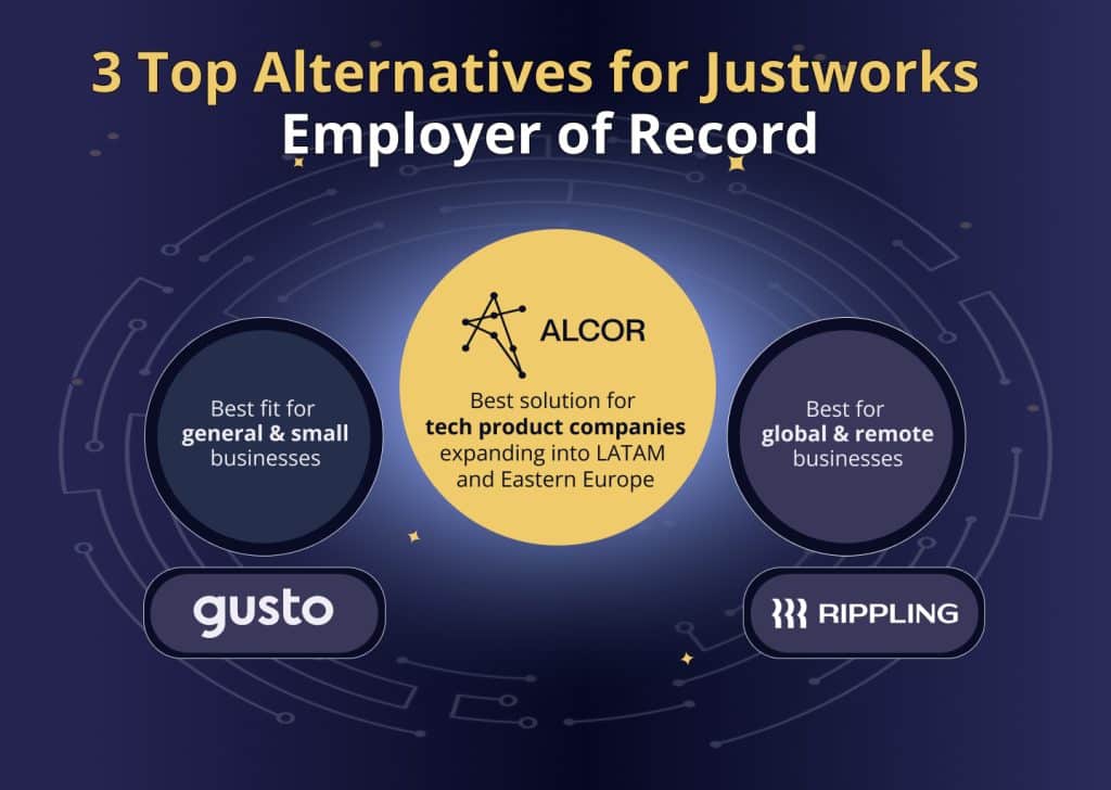 - Alternatives to Justworks differ in focus: Alcor combines tech recruitment, EOR, and operations into a single system for scaling teams; Rippling adds IT and finance automation with broader global coverage; while Gusto offers simpler pricing but relies on a third-party EOR model.