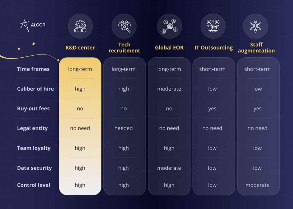 The main concerns about outsourcing and staff augmentation are possible IP issues, low team dedication, and their short-term nature. The long-term models of EOR, IT recruitment, and a tech R&D center imply hiring programmers directly and thus contribute to closer cooperation and higher loyalty. As a bonus, you retain complete control over your foreign team, development, and expenses.