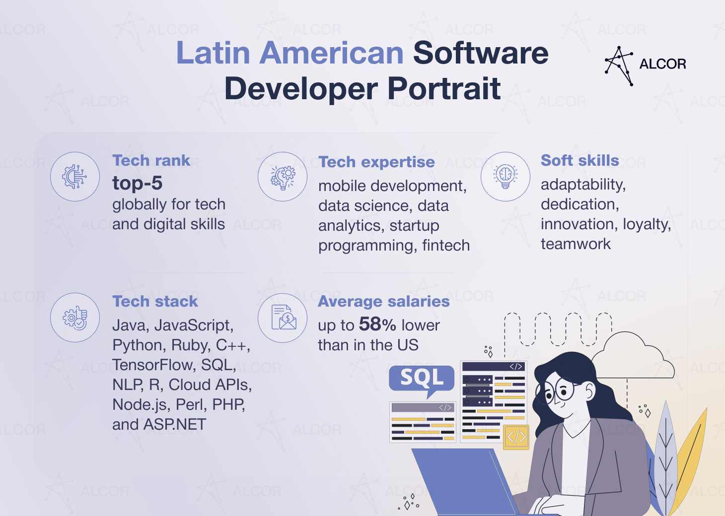 - Business culture: Software engineers in Latin America embrace a familiar work culture, demonstrating proficiency in both collaborative efforts and independent tasks. They show a high degree of dedication, going the extra mile for the success of your product.