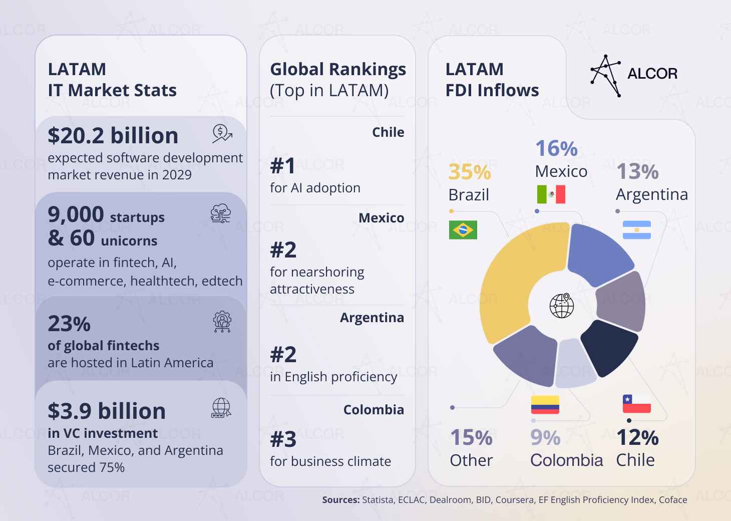 - Backed by $184.3 billion in FDI and rapid tech adoption, LATAM is emerging as a true innovation hub. 9,000 startups and 60 unicorns are fueling the IT market to hit $59.7 billion in 2025.