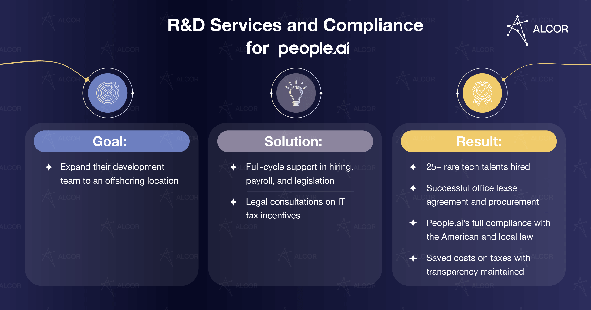 A US-based IT company, People.ai, which develops a platform with the help of machine learning and AI that streamlines team management, marketing processes, and sales, opted for this solution when expanding to Eastern Europe. To avoid typical IT outsourcing struggles, they partnered with Alcor and got a complete cycle of support in real estate, legal, and finance issues. Alcor took care of every minor step in setting up the R&D office — from IT infrastructure deployment to office preparation and redecoration. As a result, People.ai got a thriving R&D center within just 4 weeks. Eventually, it was staffed with 25 skilled developers. People.ai received complete control over its R&D center together with all intellectual property rights.
