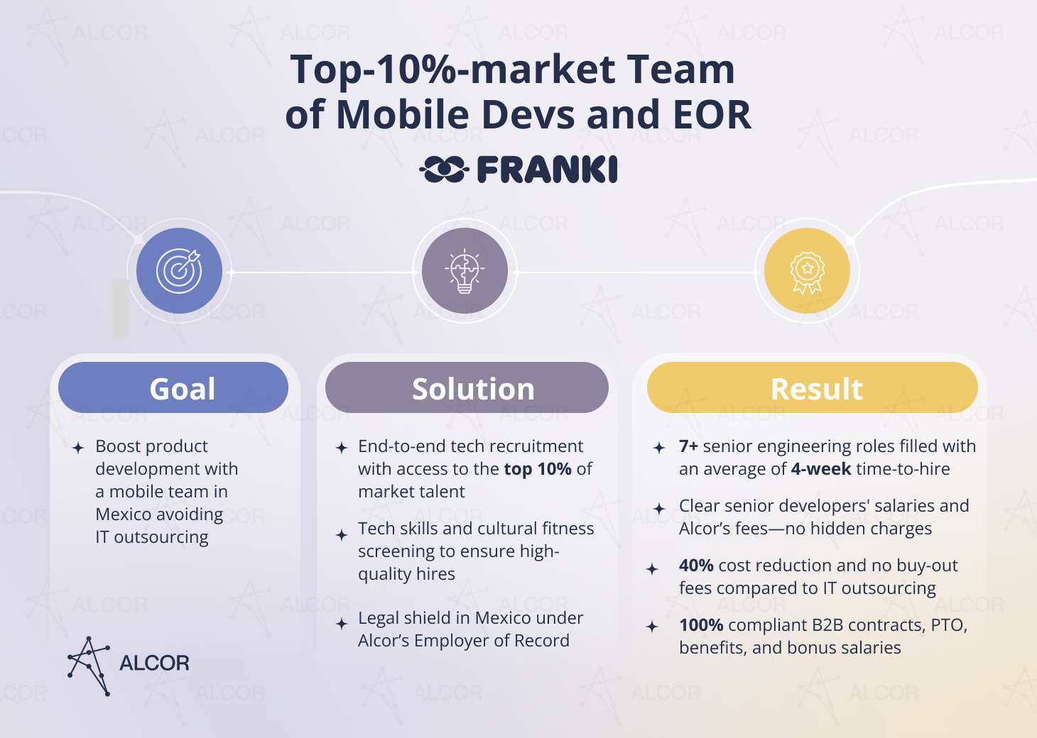 That’s exactly what Franki did. This California-based experience app startup wanted to scale product development in Mexico fast and without dealing with entity setup or legal risks. After a recommendation from our other client, they teamed up with Alcor. Within a month, our recruiters helped them build a team of elite tech talent, hiring 7+ senior engineers from the top 10% of the market with an average time-to-hire of just 4 weeks.